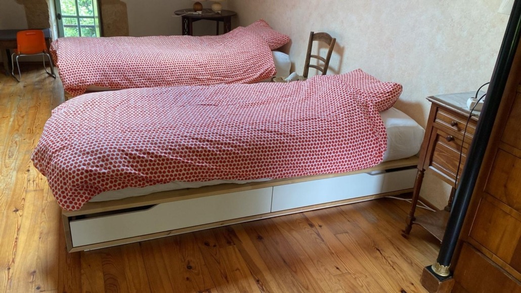 - Optie tweede slaapkamer. Deze kamer grenst direct aan de gÎte en is te bereiken via een tussendeur in de hal. Deze kamer heeft een open haard en twee eenpersoonsbedden. Zie foto’s bij het kopje ‘Prijzen’.